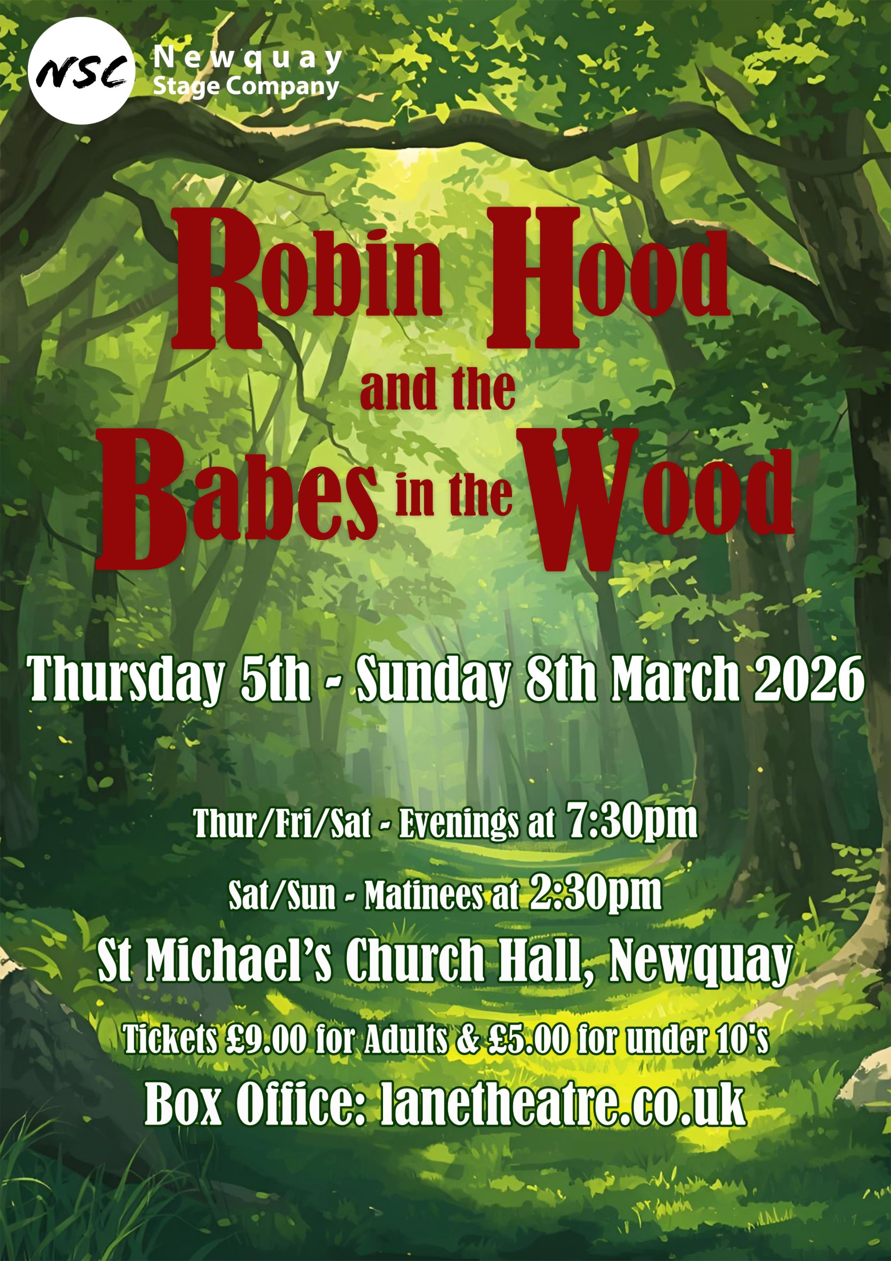 Newquay Stage Company is a friendly, talented group who perform Musicals & Pantomimes yearly in Newquay! With an experienced production team at the helm the company loves to be able to give the community of Newquay a chance to join to develop new skills in singing, acting and dancing! Newquay Stage Company are pleased to be back with pantomime this year and are proud to present Robin Hood and the Babes in the Wood, written and directed by their very own Sue Trebilcock.